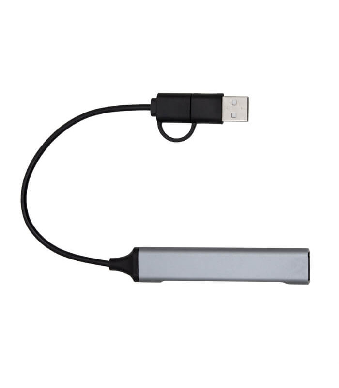 El Adaptador HUB multipuerto "HAMEL" es la solución ideal para optimizar tus conexiones y organizar tu área de trabajo. Su diseño compacto y funcional incorpora 3 entradas USB estándar y 1 USB tipo C, con salida 2 en 1 (USB + USB-C), compatible con múltiples dispositivos. Fabricado en aluminio reciclado con cable de PVC negro, combina tecnología y compromiso medioambiental. Presentado en caja de regalo kraft, es un regalo tecnológico corporativo ideal para empresas modernas y sostenibles.