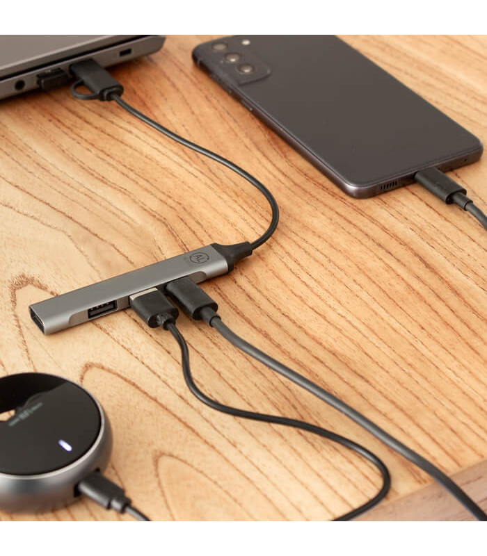 Su cuerpo de aluminio reciclado lo convierte en un accesorio ecológico y duradero, con un diseño elegante en color gris que se adapta a escritorios modernos. El cable de PVC negro ofrece flexibilidad sin enredos, asegurando una conexión estable.