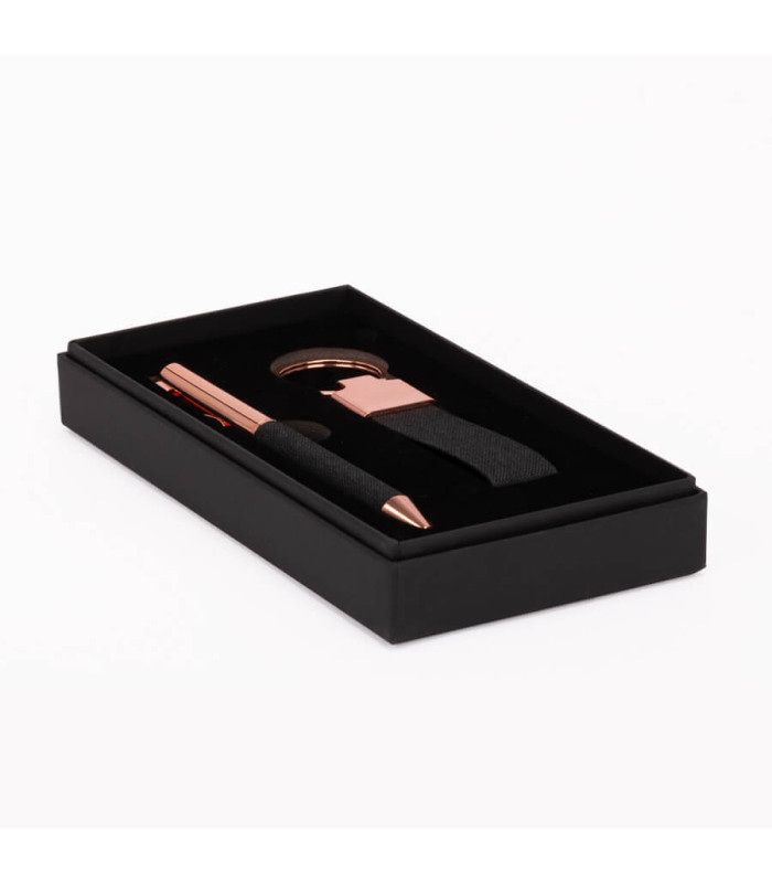 Producto: Set de Regalo MINE. Componentes: Llavero metálico encobrizado y Bolígrafo metálico coordinado. Materiales: Acero inoxidable con revestimiento encobrizado y detalles en tela Oxford negro jaspeado. Bolígrafo: Escritura fluida en color negro. Presentación: Elegante caja de cartón negra con tapa, interior en cuna de EVA aterciopelada y sobre funda de papel negro.