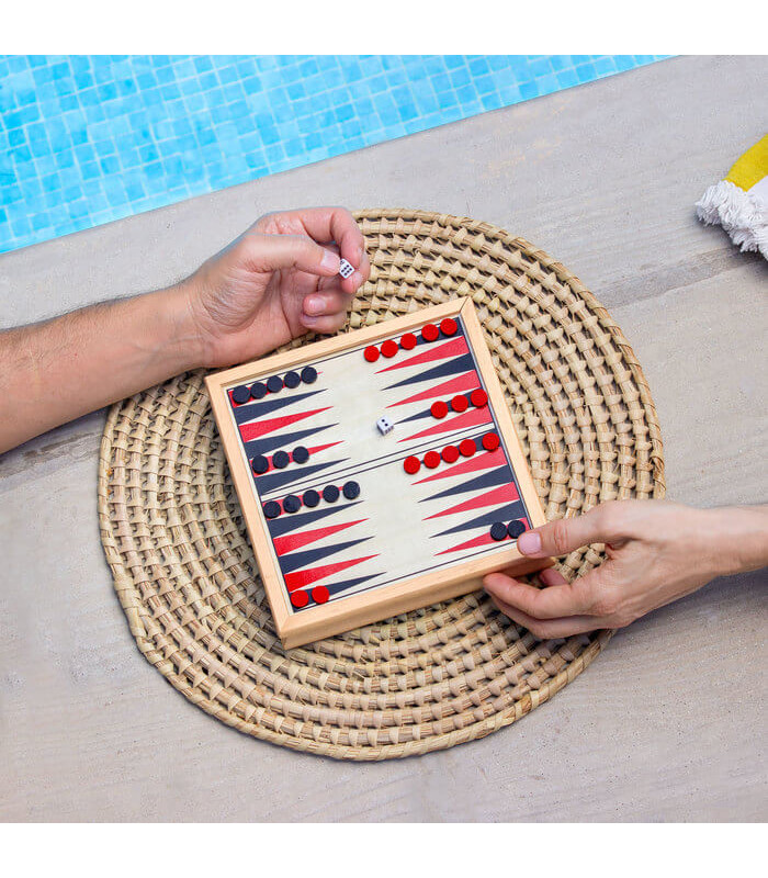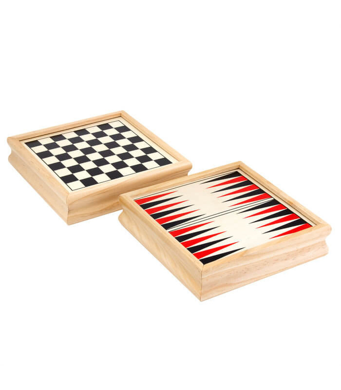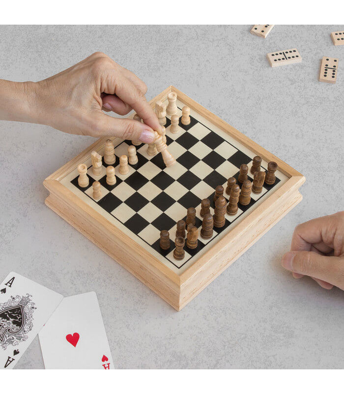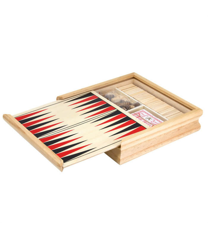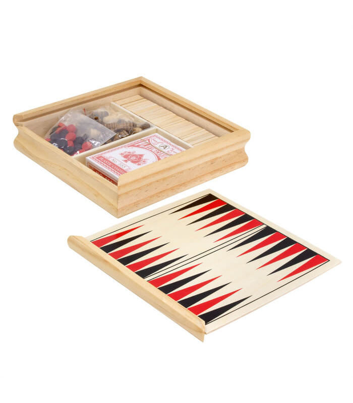 Contenido: 1 juego de cartas de poker, 1 juego de ajedrez con 32 piezas de schima, 1 dominó con 28 piezas de pino, 1 juego de damas/backgammon con 30 fichas y 2 dados