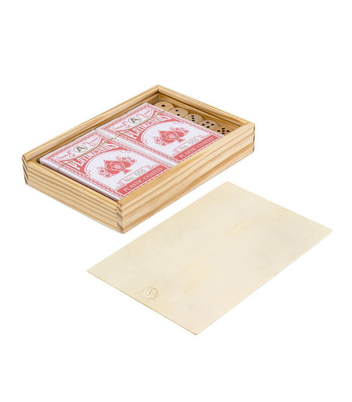 Contenido: 2 juegos de cartas de poker, 5 dados, caja contenedora de madera