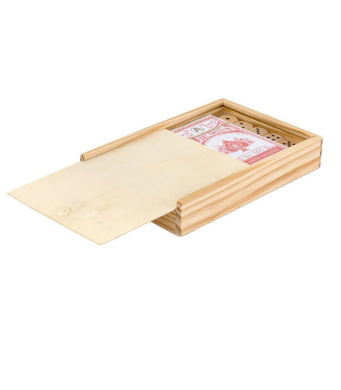Contenido: 2 juegos de cartas de poker, 5 dados, caja contenedora de madera