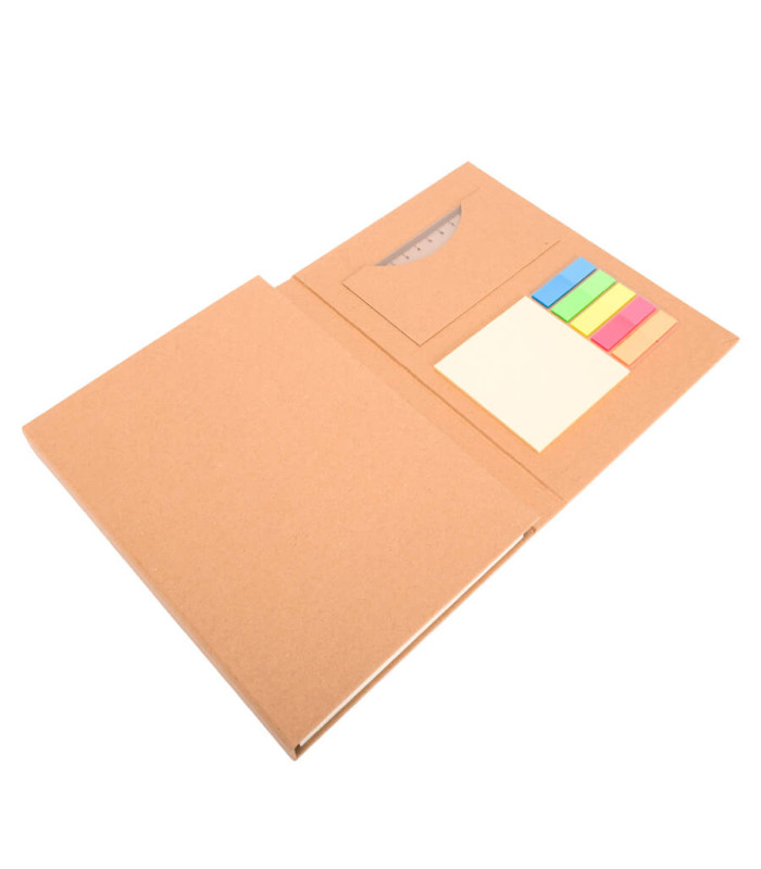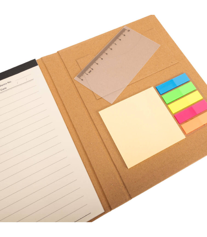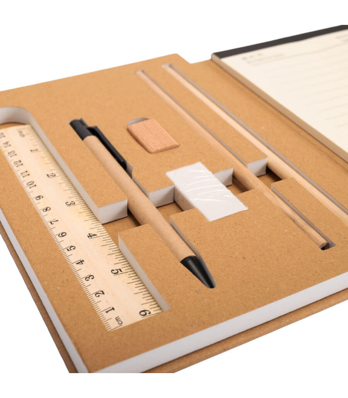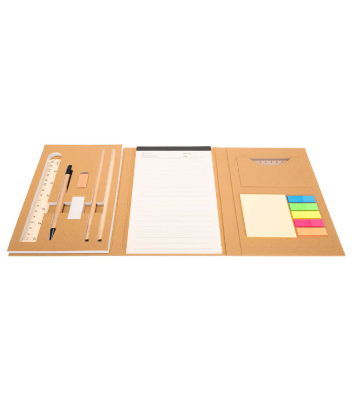 El Set de Escritorio «TRIUMPH» es una solución integral de organización fabricada en papel y cartón forrado. Contiene un Memo-set Semanal de 50 hojas marfil lineadas (14 x 20.5 cm), regla plástica de 10cm, post-it amarillos, 5 sets de banderitas adhesivas, regla de madera de 15cm, bolígrafo de papel reciclado (tinta azul), goma de borrar, sacapuntas de madera y 2 lápices de grafito. Todo organizado en un estuche desplegable con presentación en bolsa OPP.
