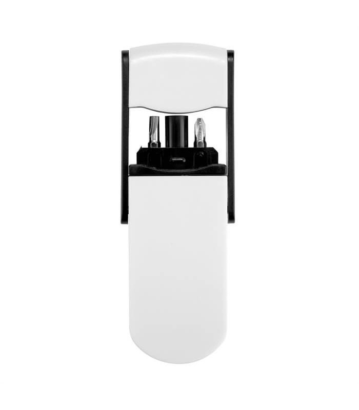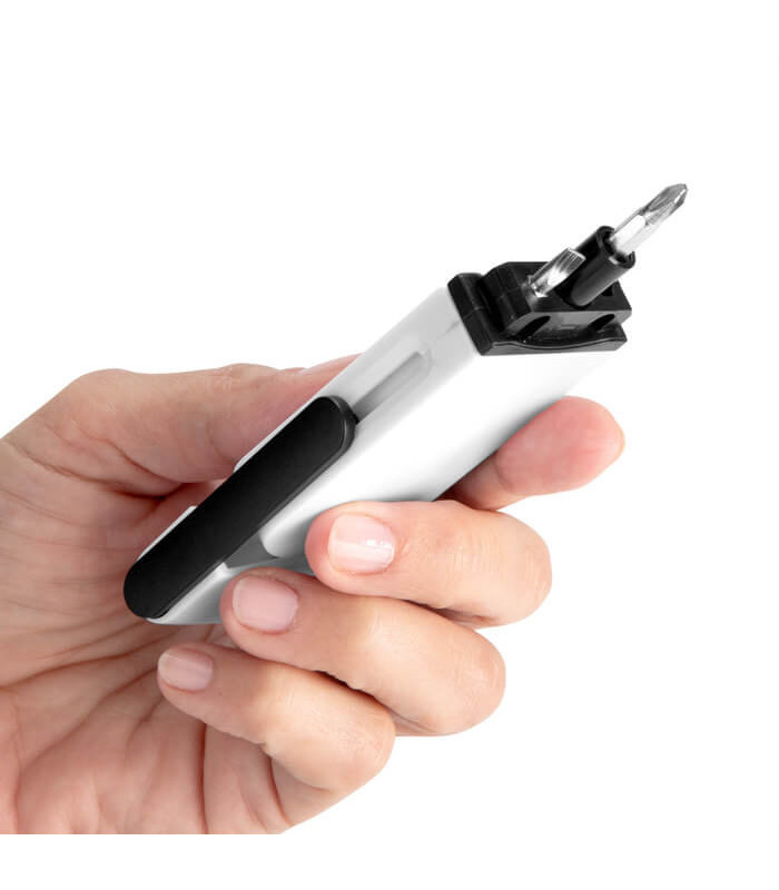 El Herramientero "BOLT" es un set compacto de herramientas multifunción ideal para el día a día en el hogar, la oficina o el taller. Incluye 2 puntas intercambiables (plana y cruz) ocultas dentro del cuerpo, fabricadas en acero CR-V de alta resistencia. Su diseño incorpora cinta métrica de 1 metro con escalas en centímetros, pulgadas y pies, cuerpo imantado para facilitar el trabajo, y sistema de apertura deslizante que optimiza el espacio. Un regalo publicitario tecnológico y funcional perfecto para campañas promocionales o kits corporativos.