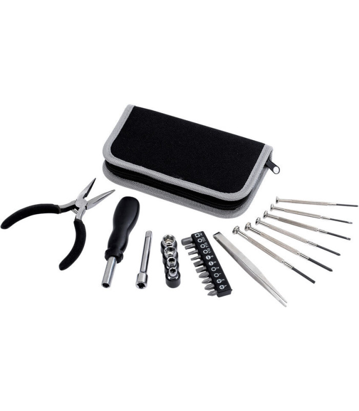 Este versátil set de herramientas de 24 piezas es ideal para tener siempre a mano en casa, la oficina o el coche. Incluye destornilladores, pinzas y múltiples complementos esenciales, organizados en un estuche negro con cierre que permite un almacenamiento práctico y seguro. Gracias a su tamaño compacto y su presentación en caja de regalo, es una excelente opción para promociones funcionales o regalos corporativos con valor añadido.