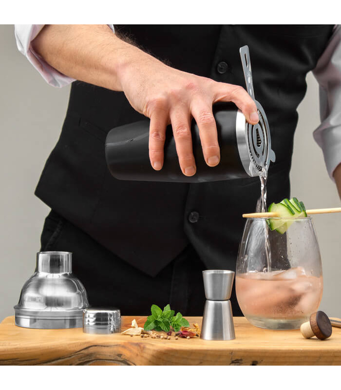 El Bartender Kit está diseñado para ofrecer una experiencia completa de coctelería. Su shaker de 600 ml es ideal para mezclar cócteles de forma homogénea, mientras que el vaso mezclador de acero 202 con acabado negro mate aporta elegancia y funcionalidad gracias a su tapa con colador integrado, permitiendo verter bebidas sin esfuerzo.