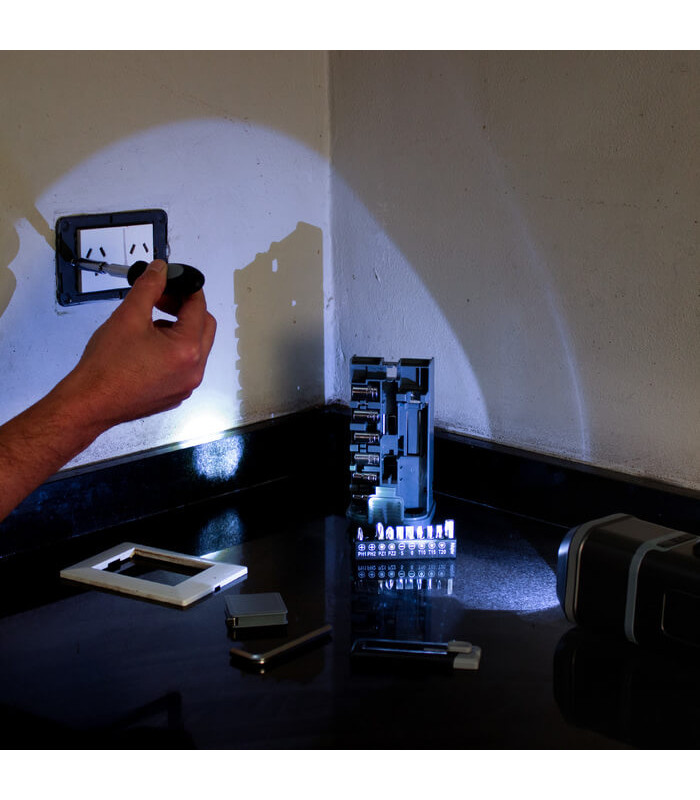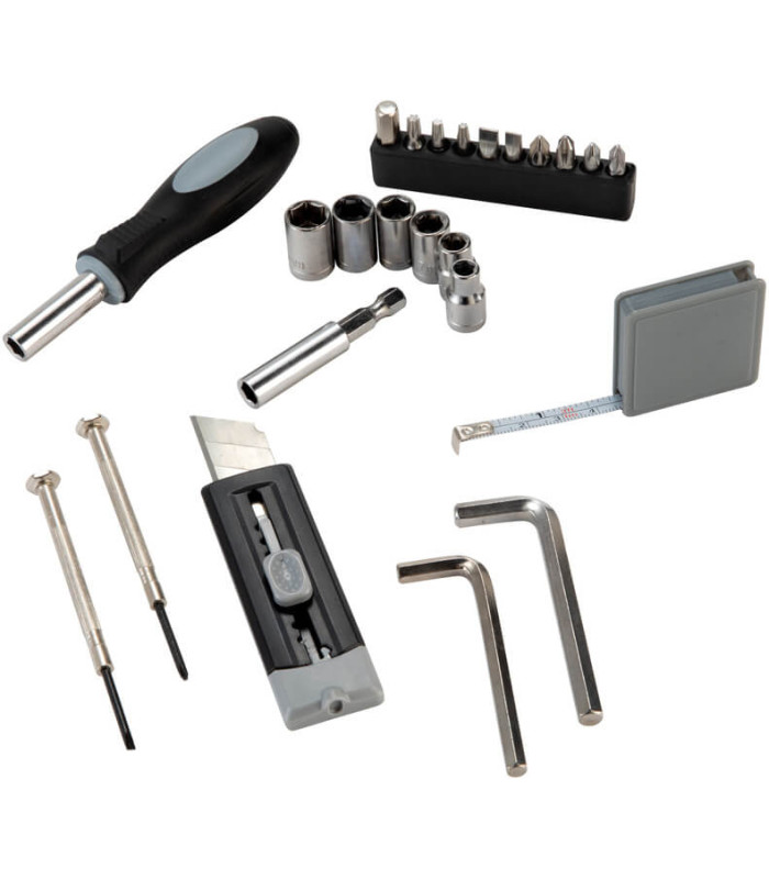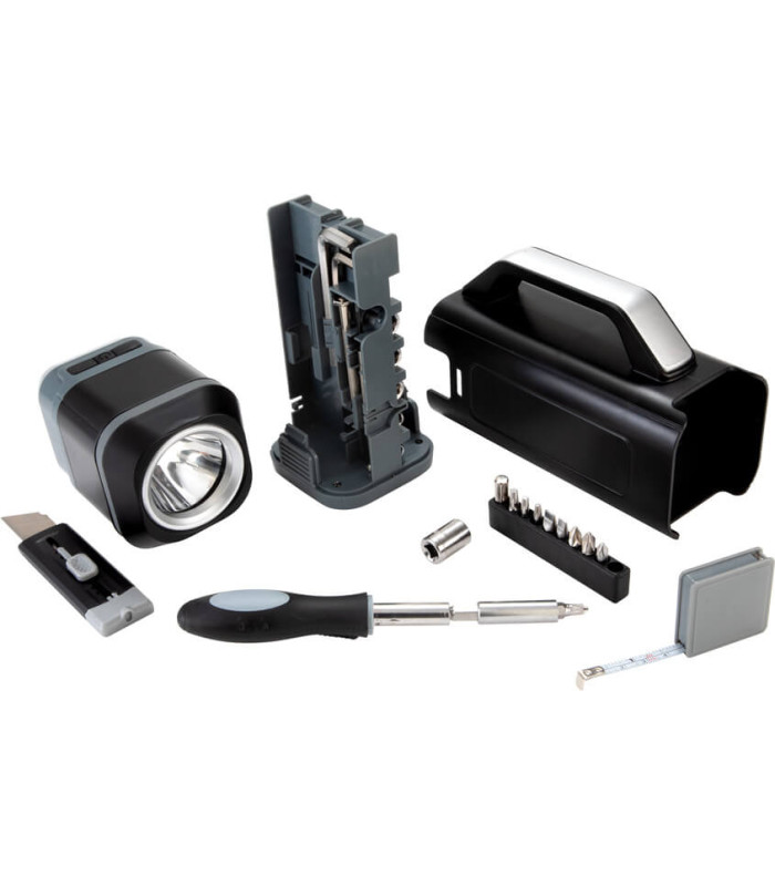 Este kit de herramientas promocional con linterna incluye: llaves allen, cutter, cinta métrica, destornilladores de precisión, barra de extensión, puntas intercambiables, llaves de tubo y cable de carga. Todo organizado en una presentación elegante, robusta y lista para entregar en acciones de marketing funcional o programas de fidelización.