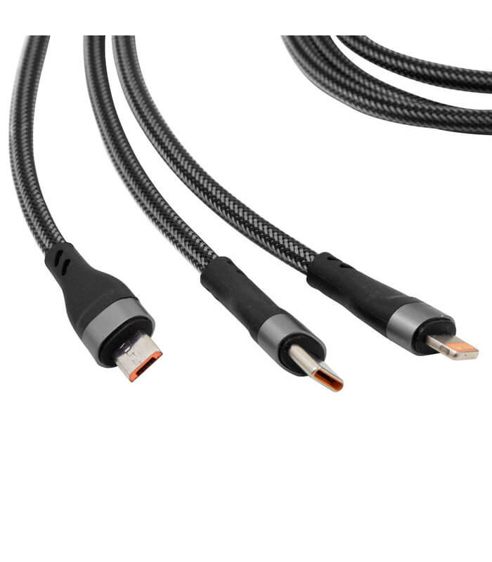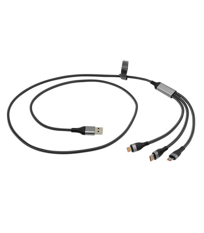 El Cable de Carga Rápida Spidy es tu aliado perfecto para mantener tus dispositivos siempre cargados y listos para usar. Con una entrada 2 en 1 (USB y USB-C) y salidas USB-C, microUSB y Lightning, este cable te ofrece compatibilidad con una amplia variedad de dispositivos. Su capacidad máxima de 20V 3A asegura una carga rápida y eficiente, y su diseño color gun con toques naranjas en los conectores le da un toque moderno y dinámico.