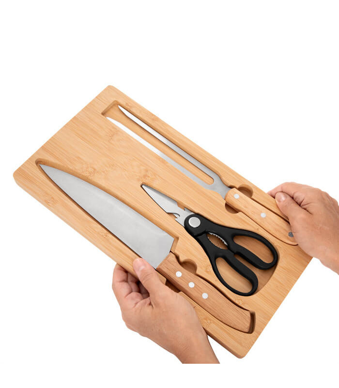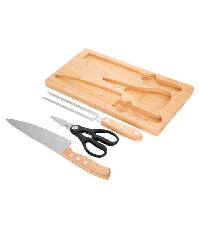 El Set de Asado BBQ BISTEC es una solución integral y sofisticada para los amantes de la parrilla, diseñada para ser el detalle que se luce en cada encuentro gastronómico. Este conjunto destaca por su tabla de corte de bambú sustentable, la cual integra un ingenioso sistema de imán en el lado opuesto para fijar de forma segura sus tres herramientas principales. El set incluye unas tijeras de cocina multiuso (aptas para aves, pescados y vegetales, con abridor de botellas y rompenueces integrados), un cuchillo chef de acero inoxidable 420 y un tenedor trinchante, ambos con mangos de madera noble. Este artículo de asado funcional combina la calidez de los materiales naturales con la precisión técnica necesaria para un servicio impecable.