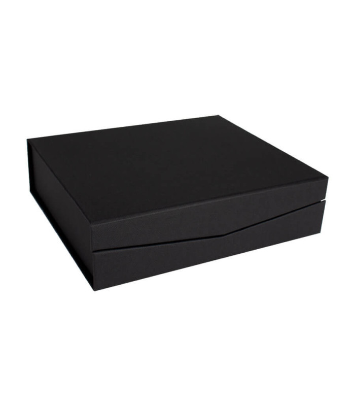 - Presentación: Caja de cartón forrado negro con cierre imantado, interior acolchado de espuma y tela poliéster satinado negro, con troquel